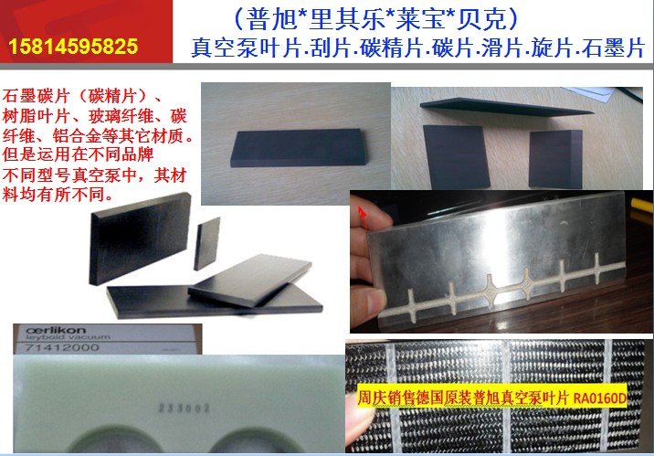 真空泵葉片.刮片.碳精片.碳片.滑片.旋片.石墨片  市面上常見的真空泵葉片材質有多種,一般有石墨碳片(碳精片)、樹脂葉片、玻璃纖維、碳纖維、鋁合金等其它材質。但是運用在不同品牌不同型號真空泵中,其材料均有所不同。技術要求  真空泵葉片的材料具有較高抗彎強度,在擾油起動時和較高入口壓力下運轉時不易變形、彎折;密度比鐵小,故離心力小,對缸壁的磨損小,不會直接與金屬咬合;可承受高溫;其長度方向的熱膨脹系數(shù)較小,與鑄鐵相當,故設計時此方向上的公差可按鑄鐵件考慮,厚度方向的膨脹系數(shù)較大,硬度較高,油潤滑摩擦因數(shù)較小,在有充分油潤滑的前提下耐磨耐用。  進口品牌真空泵:德國BUSCH普旭.德國LEYBOLD萊寶.德國BECKER貝克.德國RIETSCHLE(Gardner Denver)里其樂。英國EDWARDS愛德華等進口真空泵以及真空泵配件。(葉片.旋片.滑片.碳精片.石墨片.刮片)
